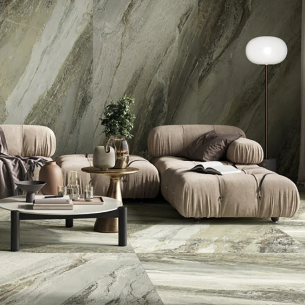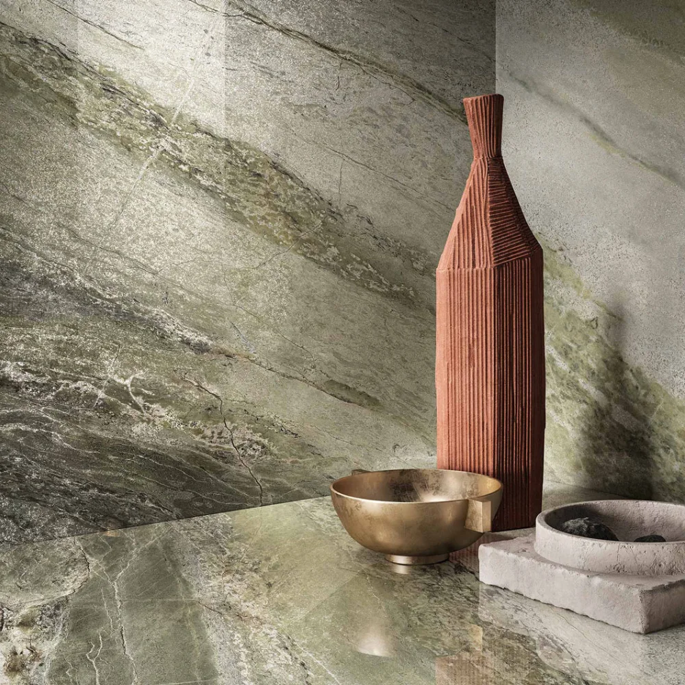 The Green Waves collection celebrates the fluid beauty of nature through the refined realism of porcelain stoneware. Inspired by the elegance of natural stone, it features sweeping green and beige veining that evokes the movement of ocean waves and the depth of sculpted marble.