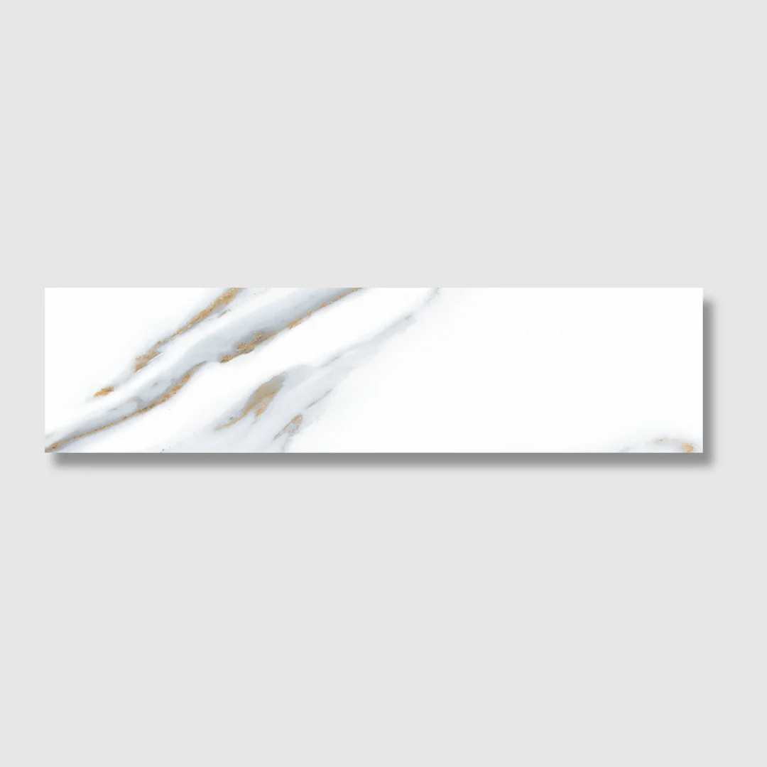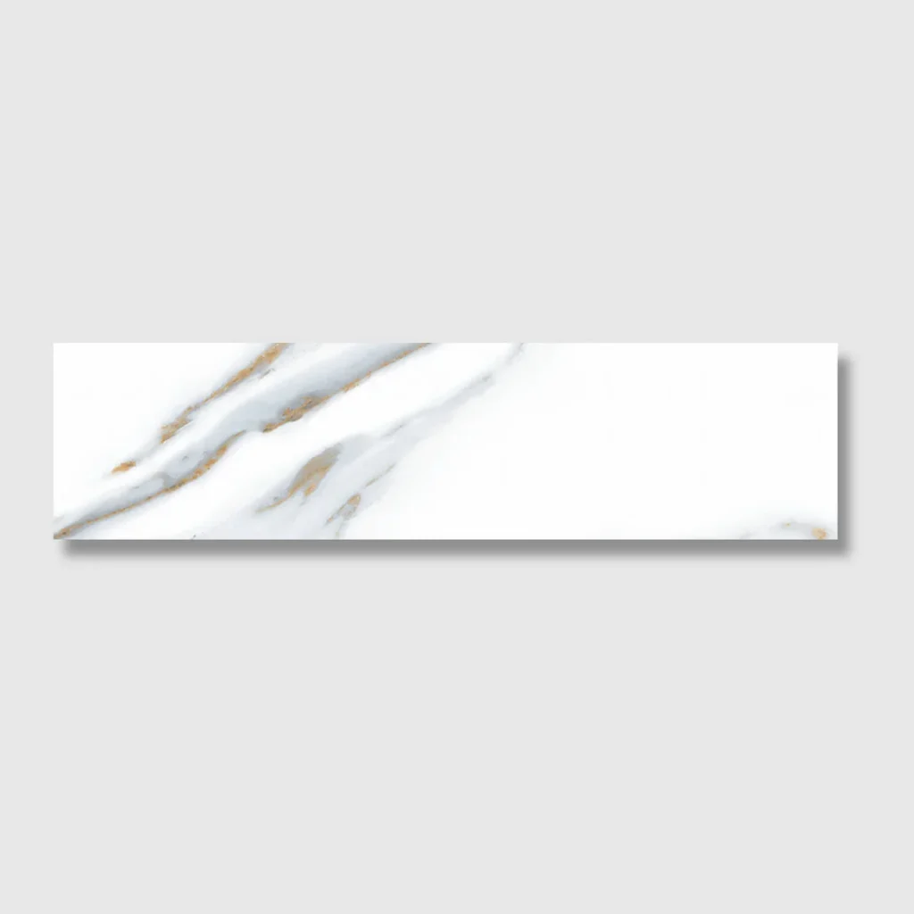 The Marble Gold Brick is a refined ceramic wall tile with a glossy marble effect finish. Its 7.5×30 cm format brings a modern metro-style look to bathrooms, kitchens and feature walls.