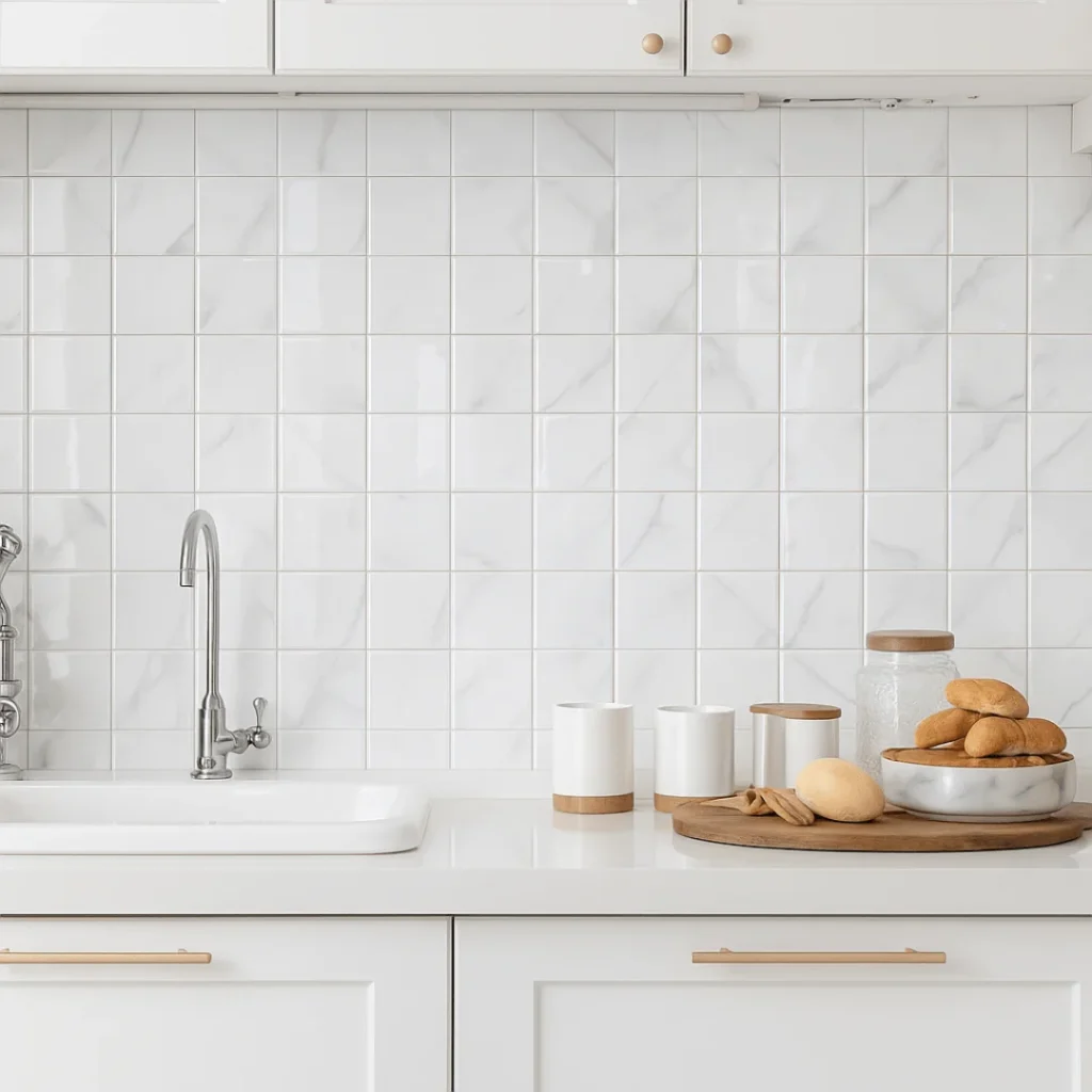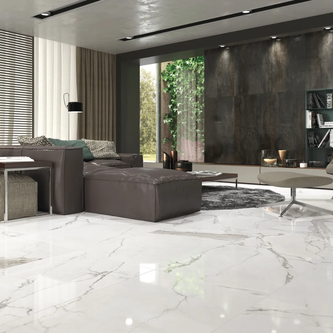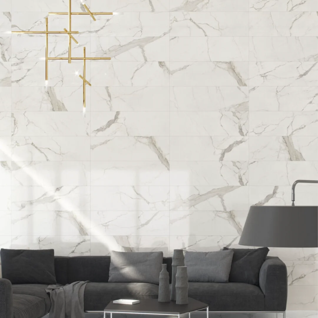 You can choose between matt and gloss finishes to suit different interior styles. Each tile features a clean white base with bold grey veining, recreating the elegance of marble without the upkeep.