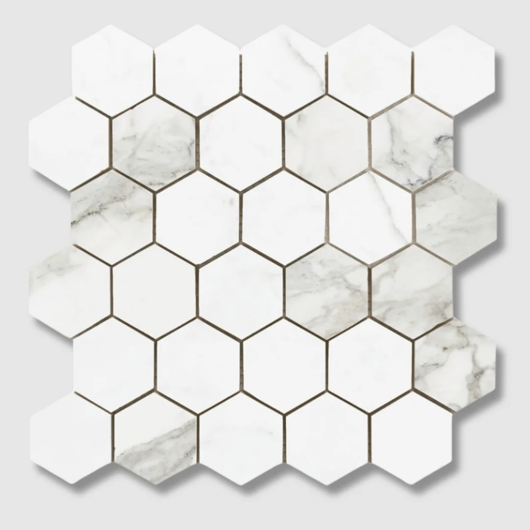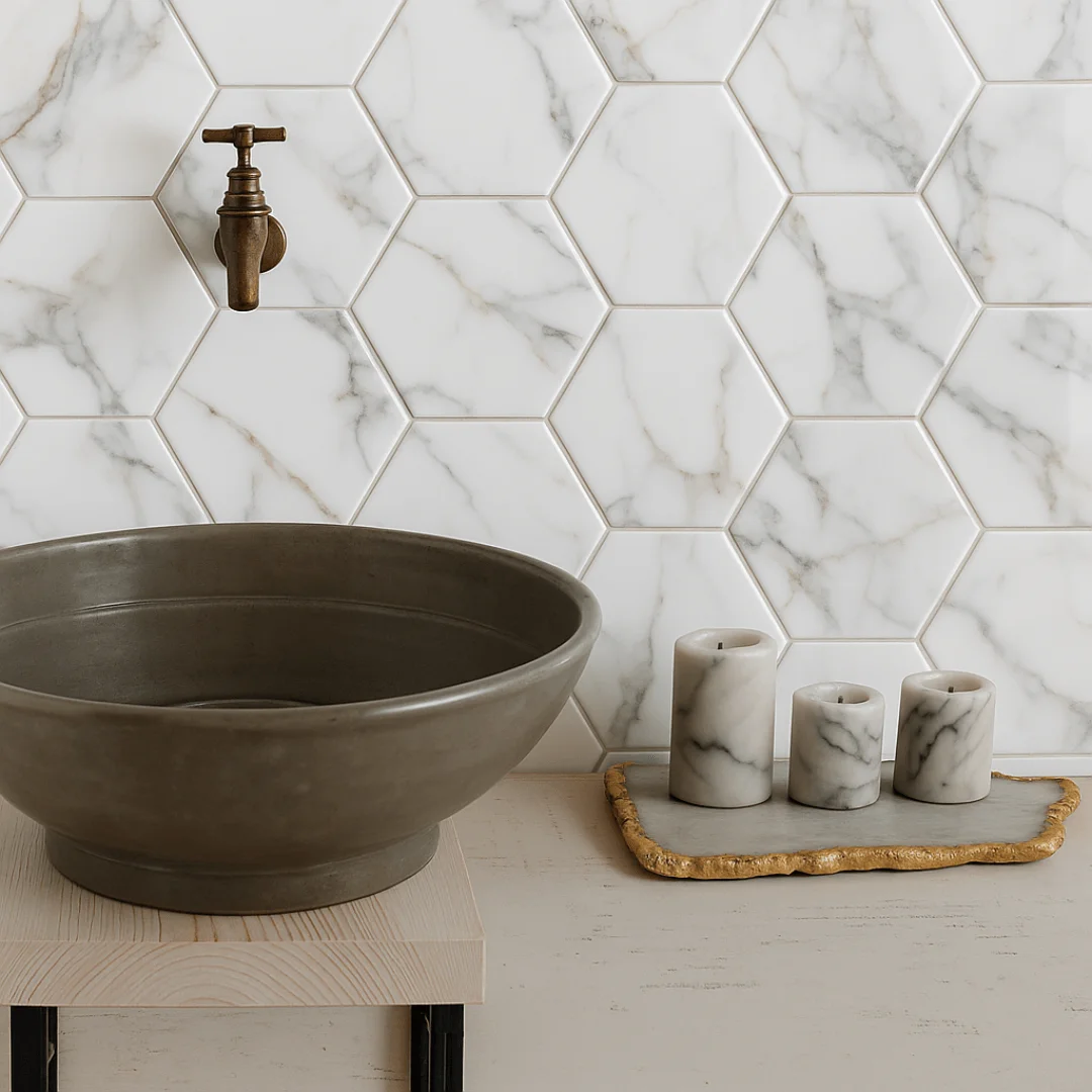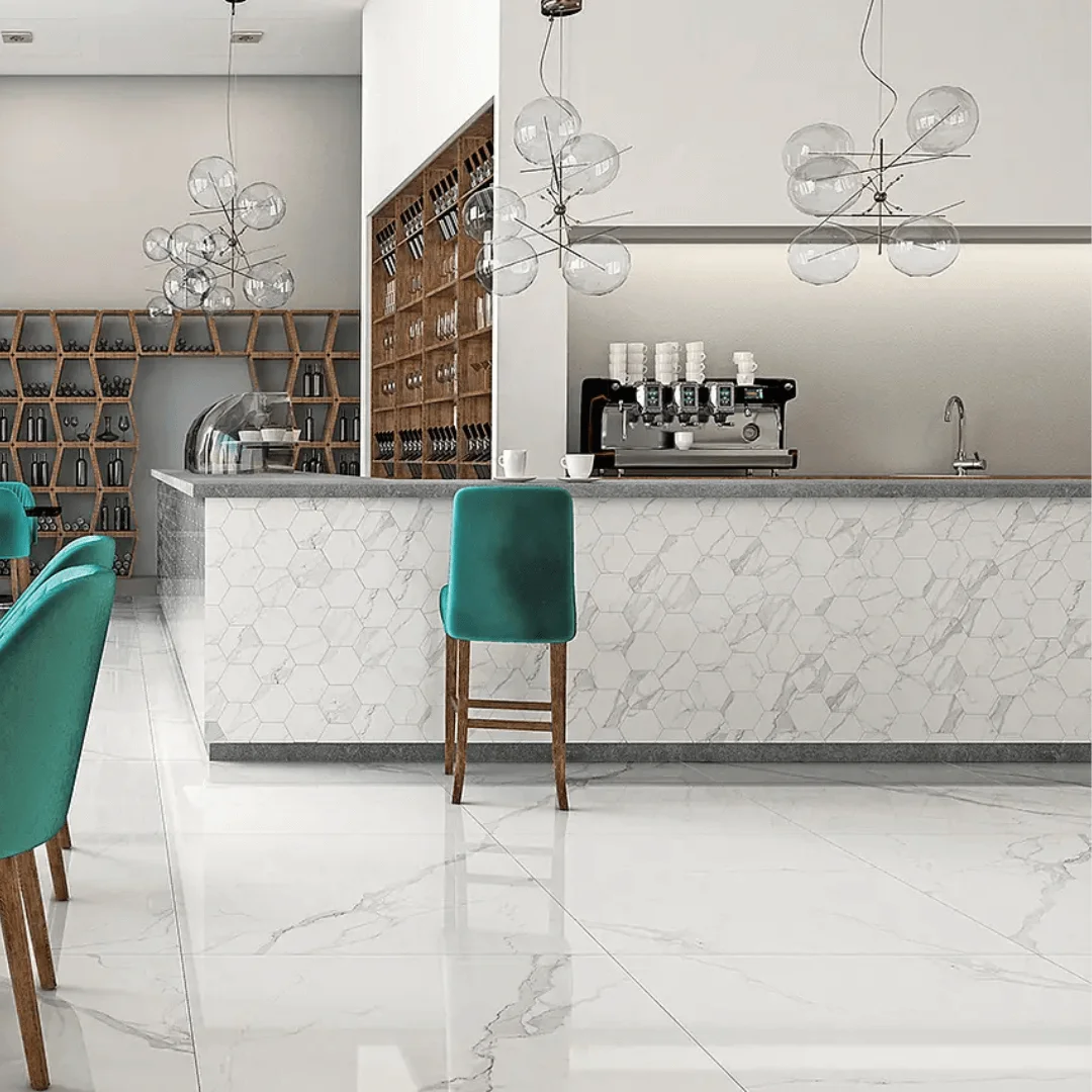 Monarch is a popular marble-effect porcelain tile collection that combines timeless style with everyday practicality. It includes several formats: 30×60 cm, 60×60 cm, and two 30×30 cm mosaics — hexagon and square. All versions are suitable for walls and floors.