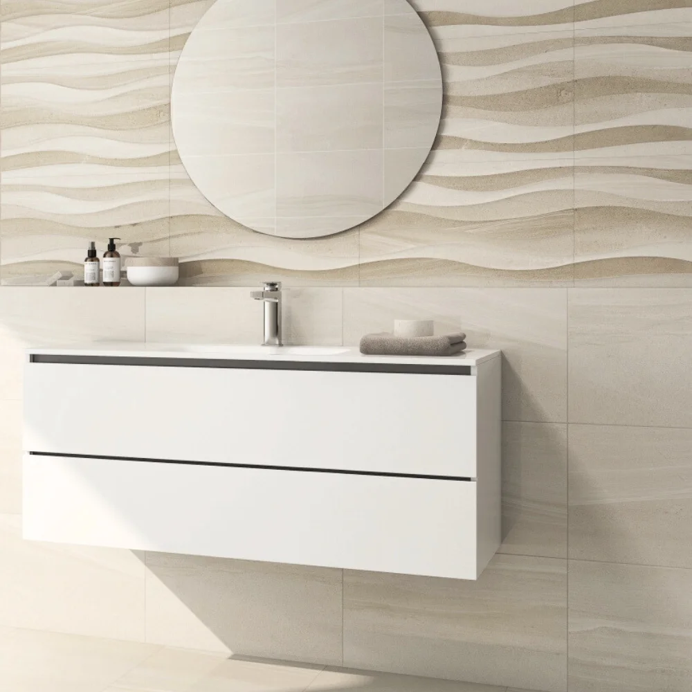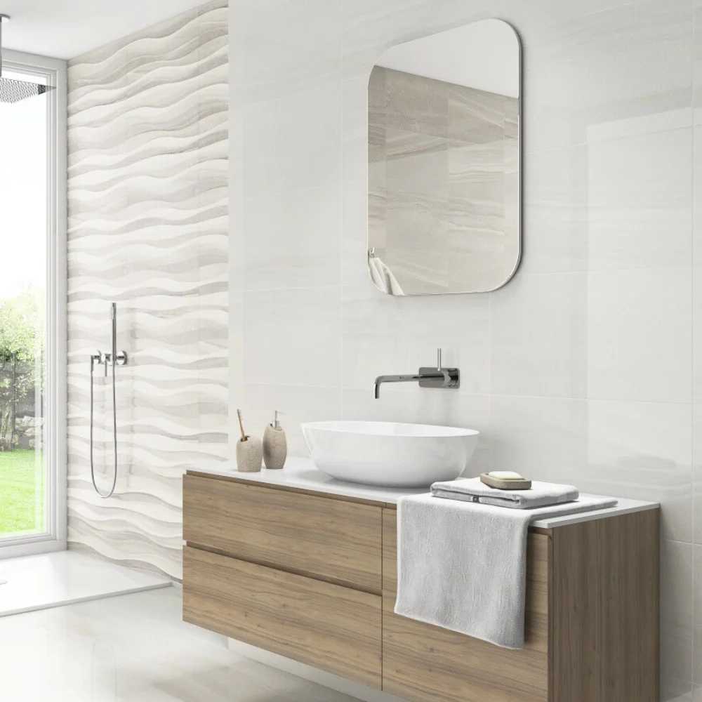 Available in four sophisticated hues — Bianco, Cream, Noce, and Silver — the collection reflects the warm tones of nature while enhancing light and depth in bathrooms, kitchens, and feature walls.