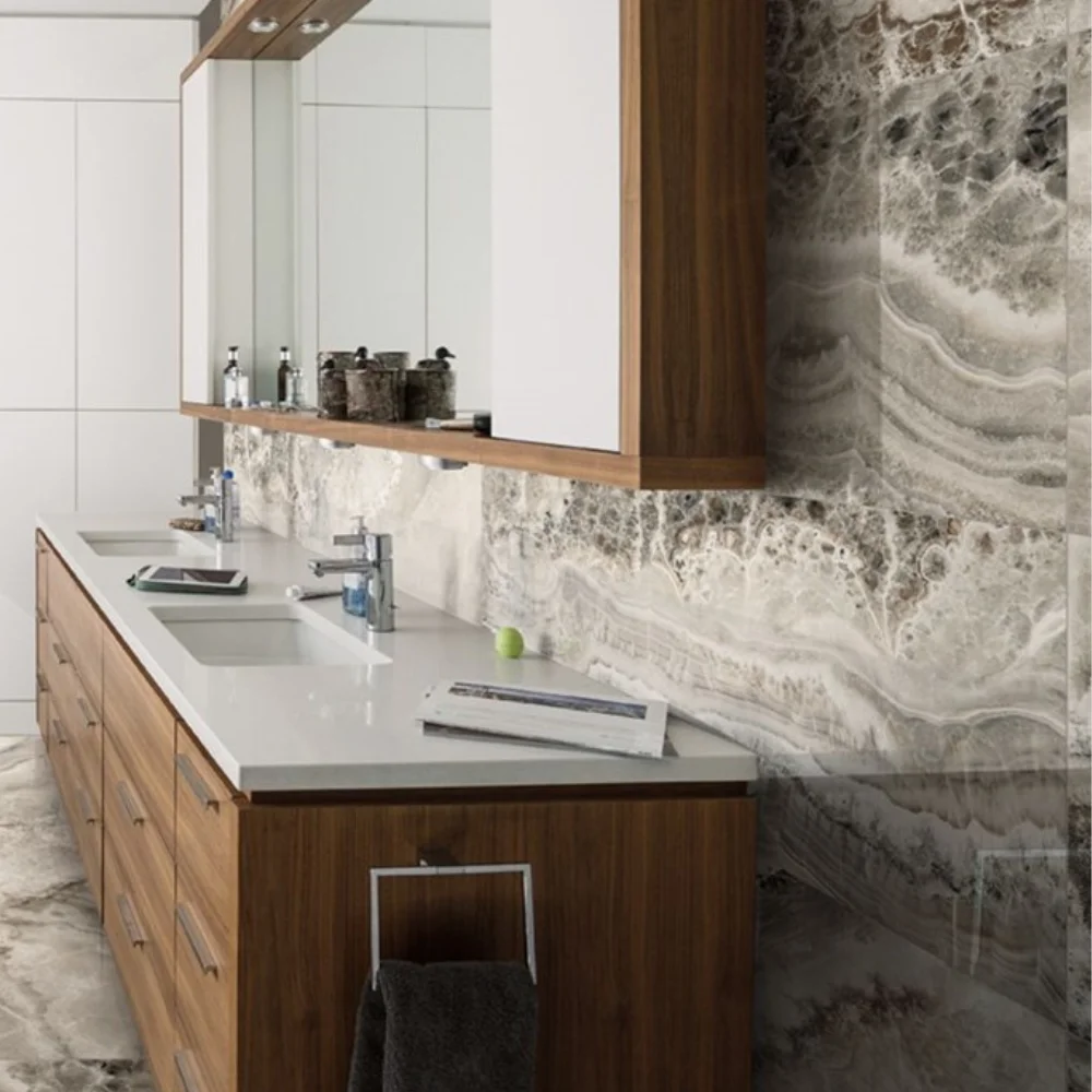 The Sublime collection offers marble-effect porcelain slab tiles in both glossy and matt finishes. Each tile features layered tones of black, ivory, and grey, enriched with warm accents of yellow, brown, and red. This unique blend of colours and intricate veining creates surfaces that feel bold, elegant, and full of depth.