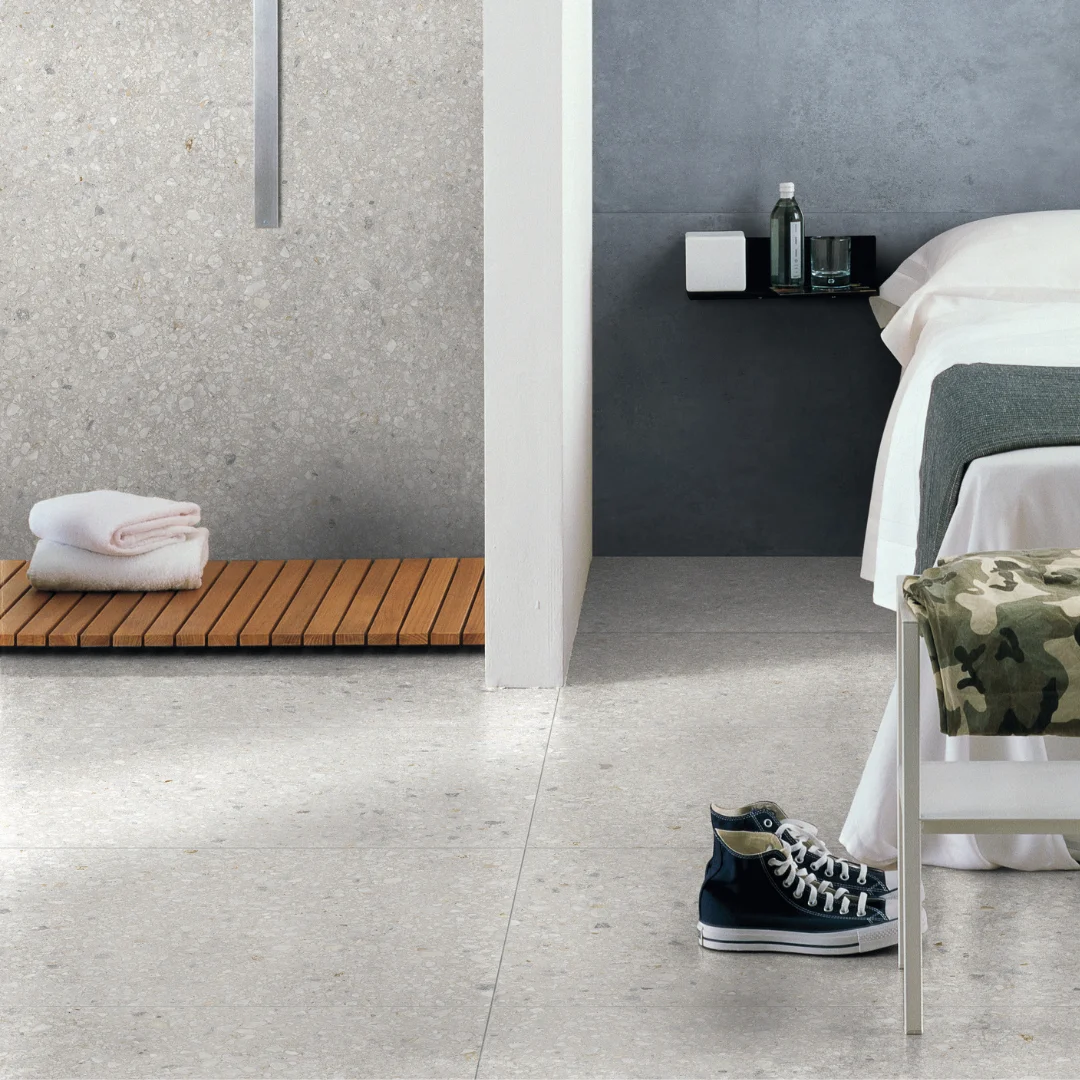 The Terrazzo collection combines timeless terrazzo charm with the strength of porcelain. Available in three terrazzo tones – Sugar, Coffee, and Earl Grey – these tiles capture the beauty of stone fragments set in a matt surface.