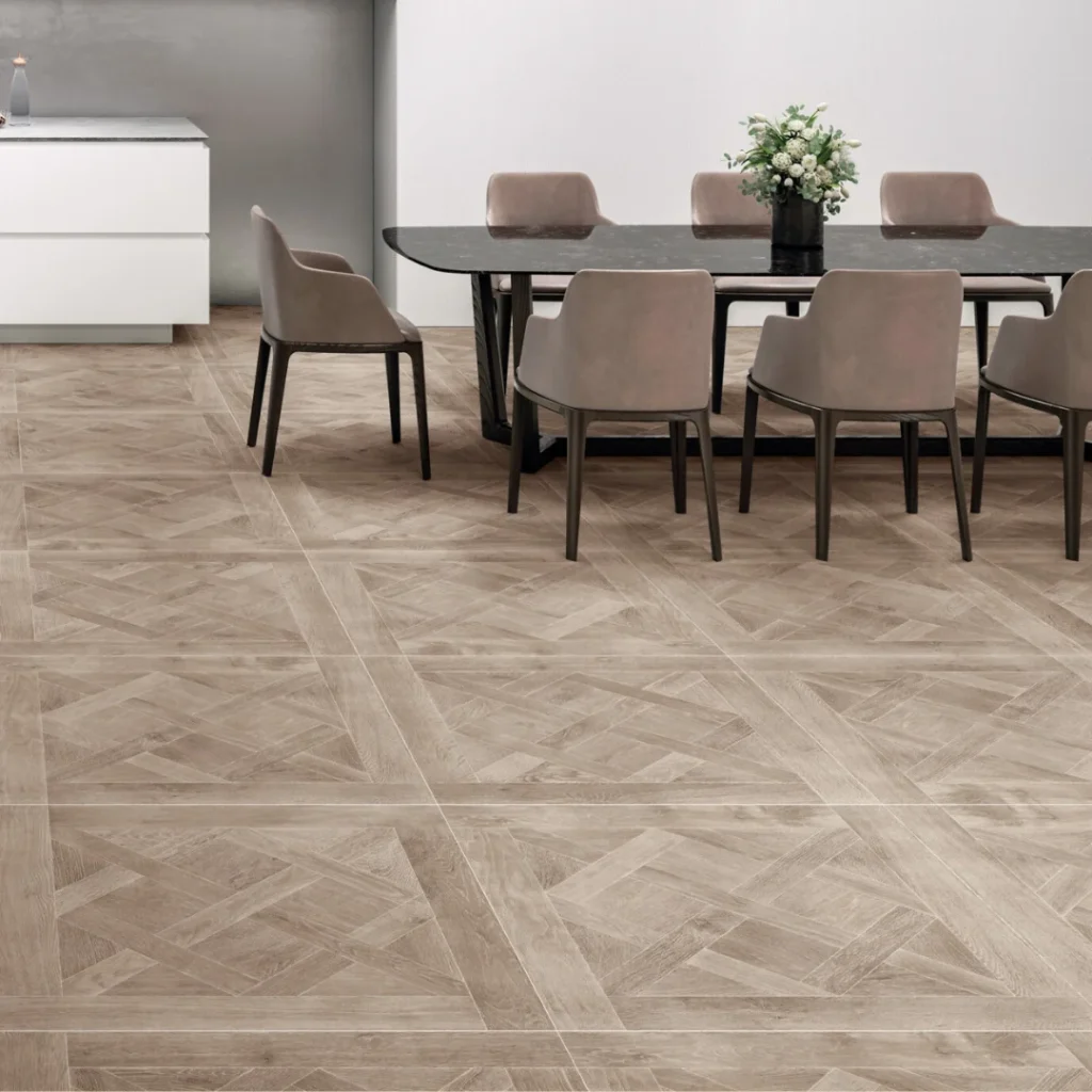 The Whistler Mocha 90×90 adds timeless elegance to interiors with its oak-inspired surface and refined Versailles marquetry pattern. This Versailles wood-effect porcelain tile combines the charm of parquet with the durability of porcelain stoneware.
